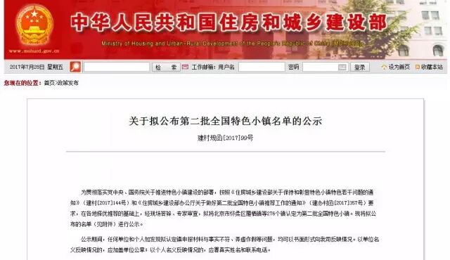 关于拟公布第二批全国特色小镇名单的公示