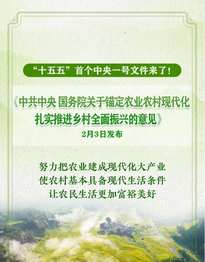 农业农村现代化关系中国式现代化全局和成色。“十四五”时期,农业综合生产能力迈上新台阶,脱贫攻坚成果巩固拓展,农民生活水平显著提高,乡村全面振兴取得明显进展。“十五五”时期是基本实现社会主义现代化夯实基础、全面发力的关键时期,要加快补上农业农村领域突出短板,加快建设农业强国。2026年是“十五五”开局之年,做好“三农”工作至关重要。要坚持以习近平新时代中国特色社会主义思想为指导,深入贯彻党的二十大和二十届历次全会精神,认真落实四中全会部署,全面贯彻习近平总书记关于“三农”工作的重要论述和重要指示精神,坚持把解决好“三农”问题作为全党工作重中之重,坚持和加强党对“三农”工作的全面领导,完整准确全面贯彻新发展理念,坚持稳中求进工作总基调,坚持农业农村优先发展,坚持城乡融合发展,锚定农业农村现代化,以推进乡村全面振兴为总抓手,以学习运用“千万工程”经验为引领,以改革创新为根本动力,提高强农惠农富农政策效能,守牢国家粮食安全底线,持续巩固拓展脱贫攻坚成果,提升乡村产业发展水平、乡村建设水平、乡村治理水平,努力把农业建成现代化大产业、使农村基本具备现代生活条件、让农民生活更加富裕美好,为推进中国式现代化提供基础支撑。